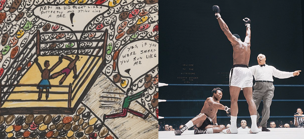 According to Aliโs obituary in the New York Times, the boxerโs father Cassius Marcellus Clay Sr. was โa church muralist who blamed discrimination for his failure to become a recognized artist.โ There were early signs that Ali had inherited that artistic inclination from his father. Apparently, throughout high school, โthe only subjects in which he received satisfactory grades were art and gym.โ