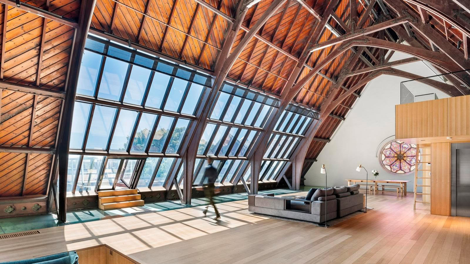 As it turns out, not only is the outside so spectacular you almost hesitate to believe itโs a residential property, but the inside is even more jaw-dropping in scale and grandeur. The stained-glass windows are beautiful, the exposed bluestone walls are a piece of history, and the soaring ceiling is as close to a work of art as it is to engineering.