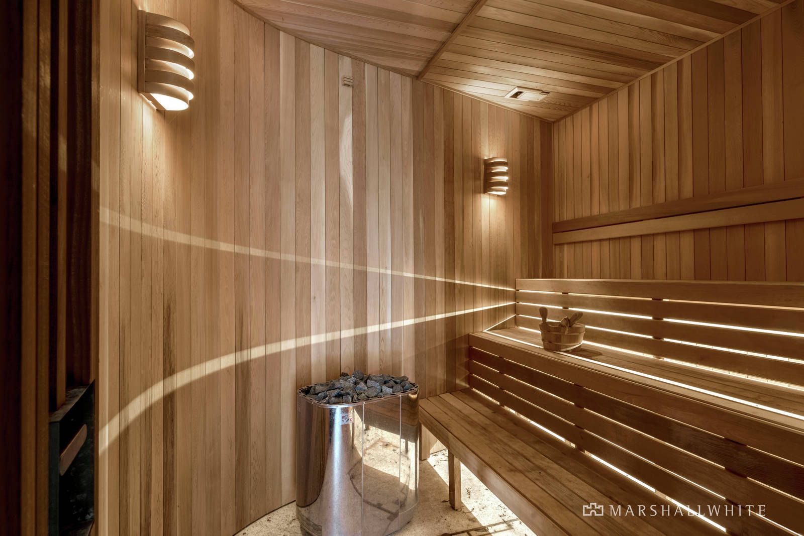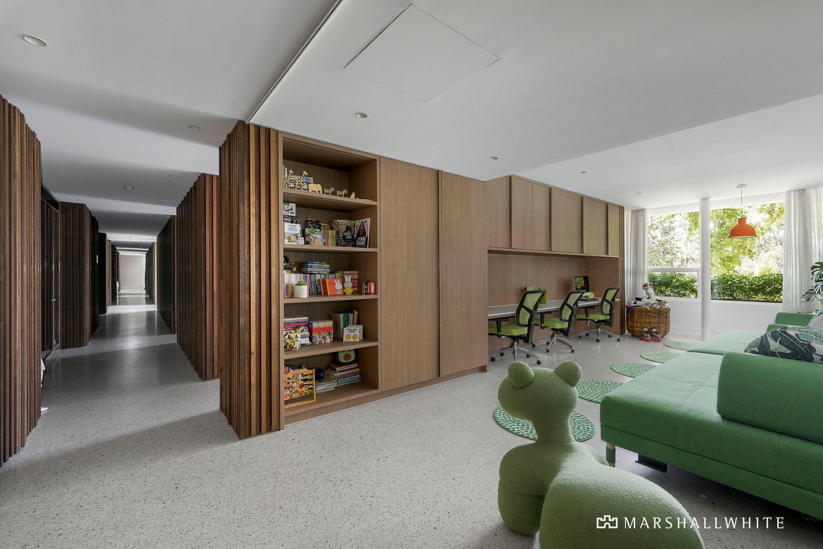 The lower ground level, closest to the riverโs edge, and the gardens that fill the space between it and the home, is where youโll find most of the bedrooms โ almost all of which feature ensuite bathrooms โ and the home office. From there, twin sets of stairs on each side of the home run down to the level of the swimming pool, where tranquillity and calm are easiest found.