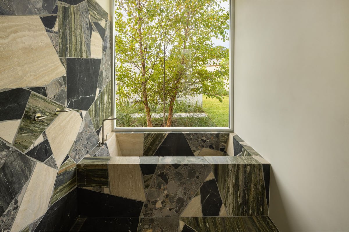 Upstairs and you’ll find three bedrooms with bathrooms demonstrating the designer’s impressive knowledge of stone masonry clear thanks to the travertine surfaces that have been laid out in the Italian style of Palladiana terrazzo. The bathrooms truly are a sight to behold.