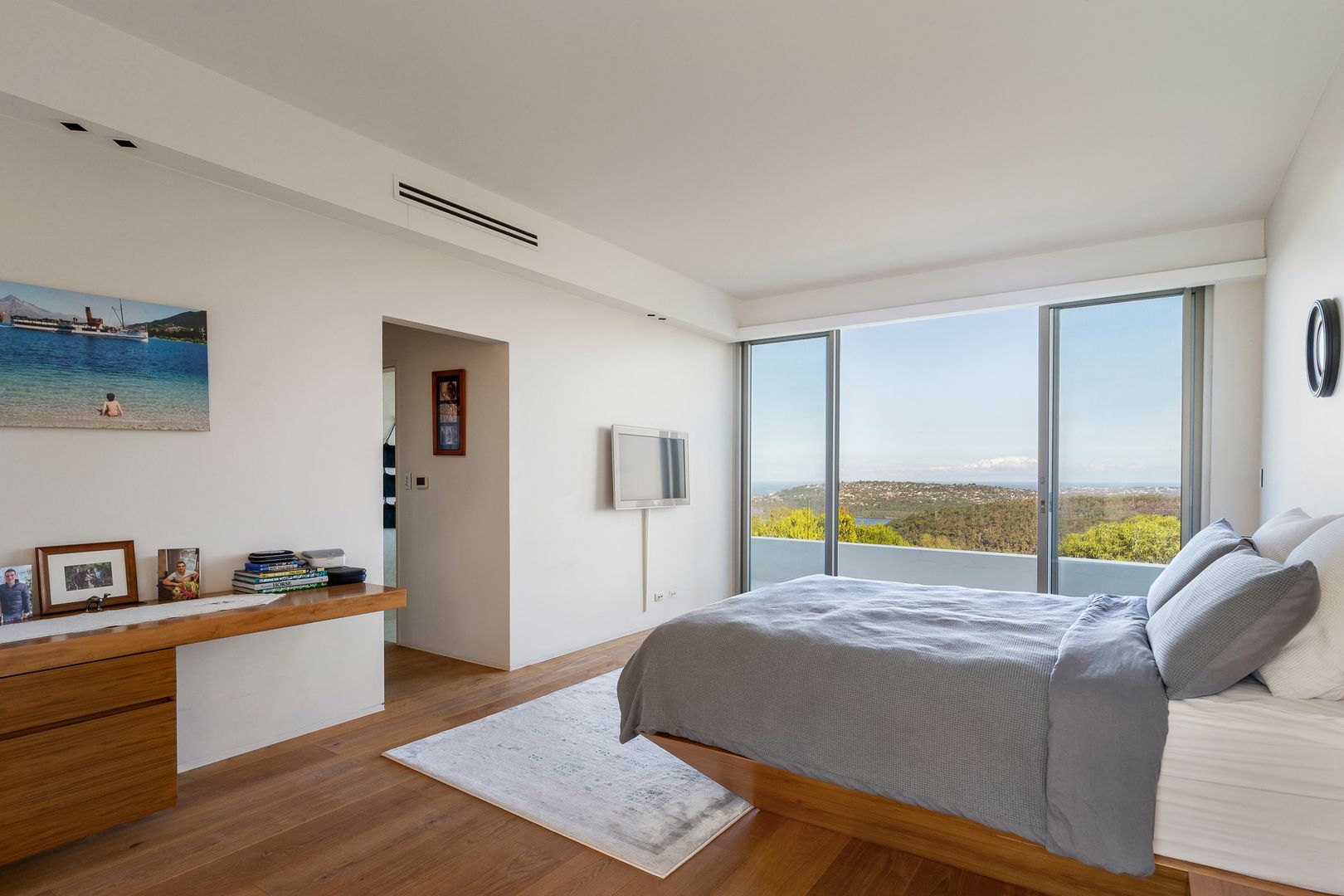 Effectively constructed as a pair of linked ovals, almost all of the residence is contained on a single level, however thanks to the topography of the property each bedroom also enjoys its own balcony. Arriving up the stairs into a long entrance hallway, youโll find the main lounge space to your left, which in turn opens up onto the main open-air terrace in the home.