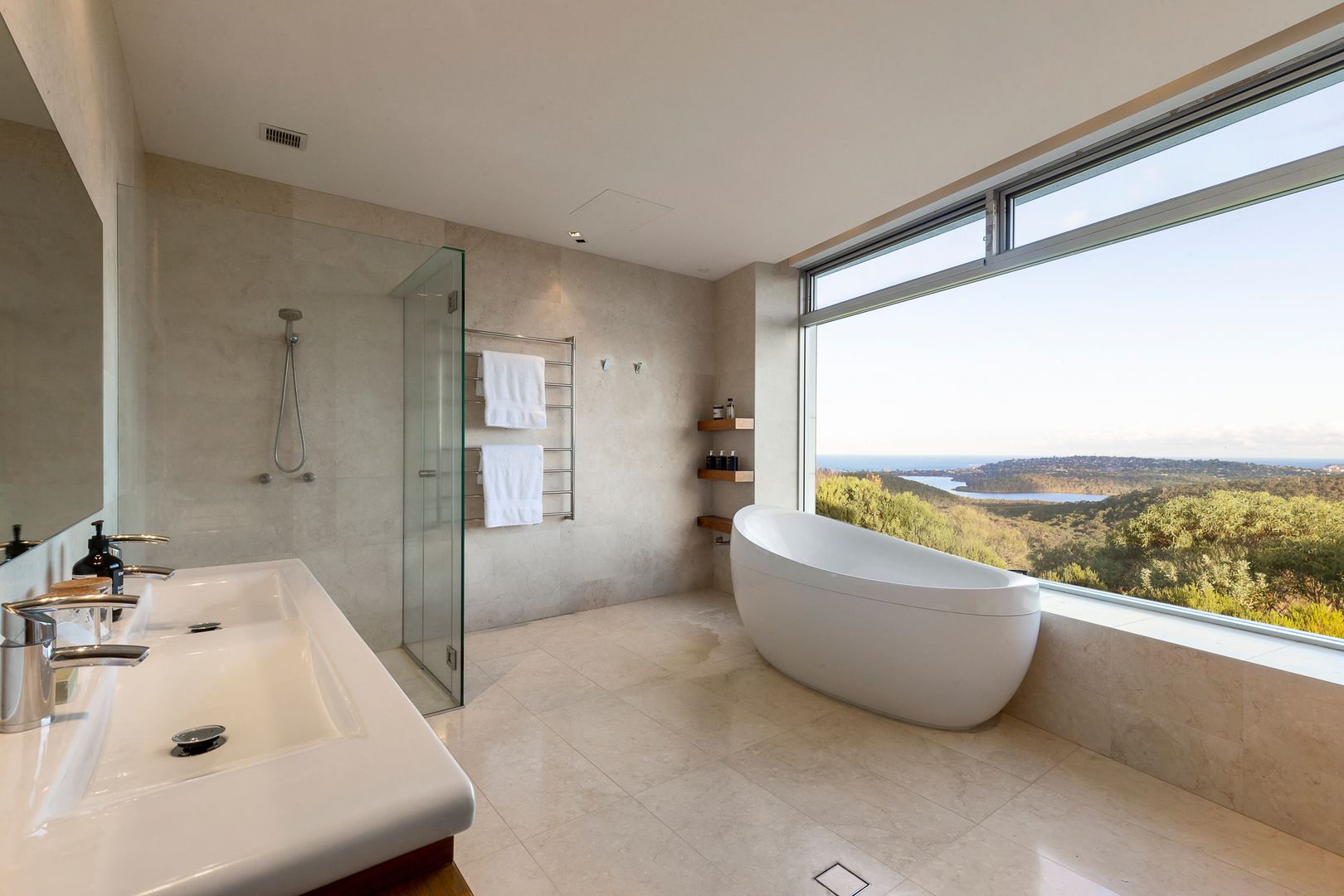 While the landscape and view are key drawcards in their own right, the home itself is truly spectacular, featuring an evenly split five bedrooms, bathrooms and car spaces. Tucked away at the end of a cul-de-sac, the buildingโs design tips its cap to the spirit of a contemporary resort, while offering equal amounts of privacy and natural light.