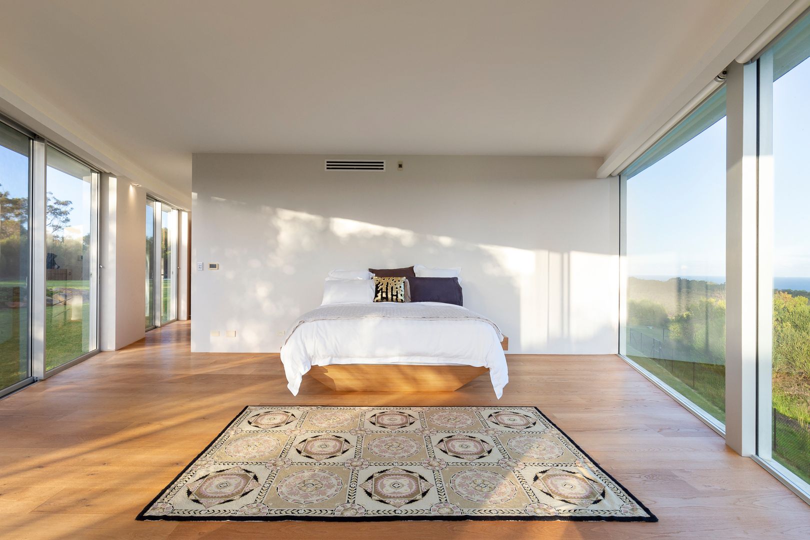 Adjacent to the lounge space is the cinema and study, while if you continue along the main entrance hall youโll arrive at an enormous open-plan area that contains the kitchen, dining and living spaces. Past this central communal area and youโll find all five south-east facing bedrooms, with the master bedroom at the very tip of the building. Enjoying 270-degree views over its balcony, the master bedroom also features a large walk-in-robe and ensuite bathroom complete with a bath that presents floor to ceiling views toward the water.