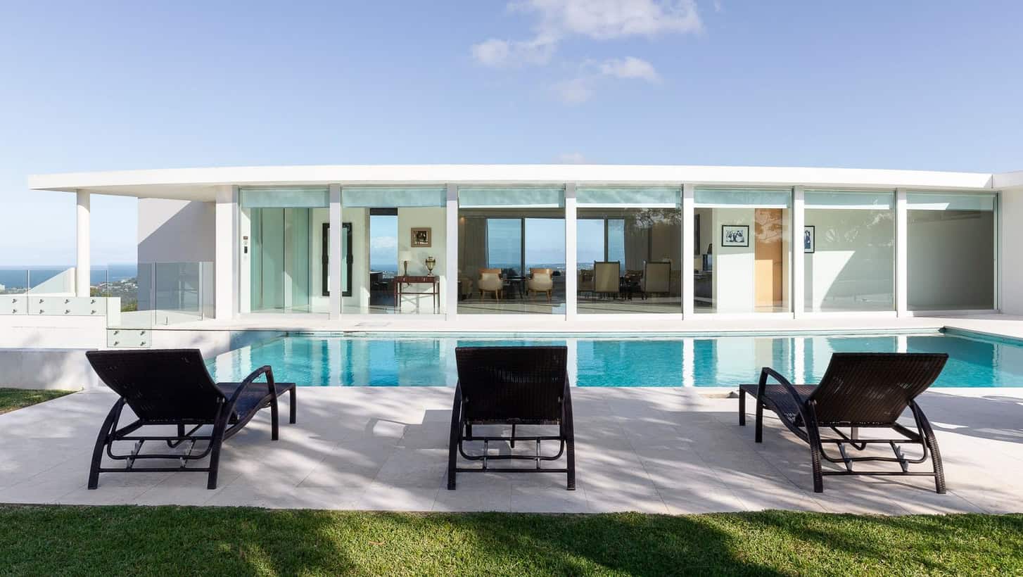 The final, and arguably most compelling, element of the home is the turquoise blue infinity pool that sits cosily adjacent to the main entrance hall. The shimmering waters contrast against the white columns and walls of the residence, immediately reminding us of Slim Aaronsโs iconic style of poolside photography.