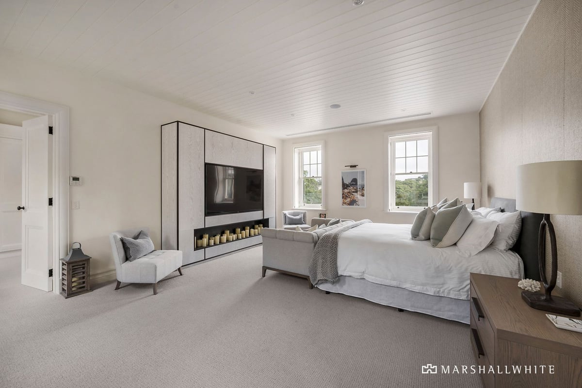 The house reminds of the grand Cape Cod-style homes of the East Hamptons, offering the visual impression of restrained elegance, despite the scale of the home. Featuring two levels of soaring ceilings, the central entrance to the property leads to a relaxed lounge room, that in turn gives way to a spacious outdoor terrace, pool, and spa. The seasoned entertainerโs dream.
