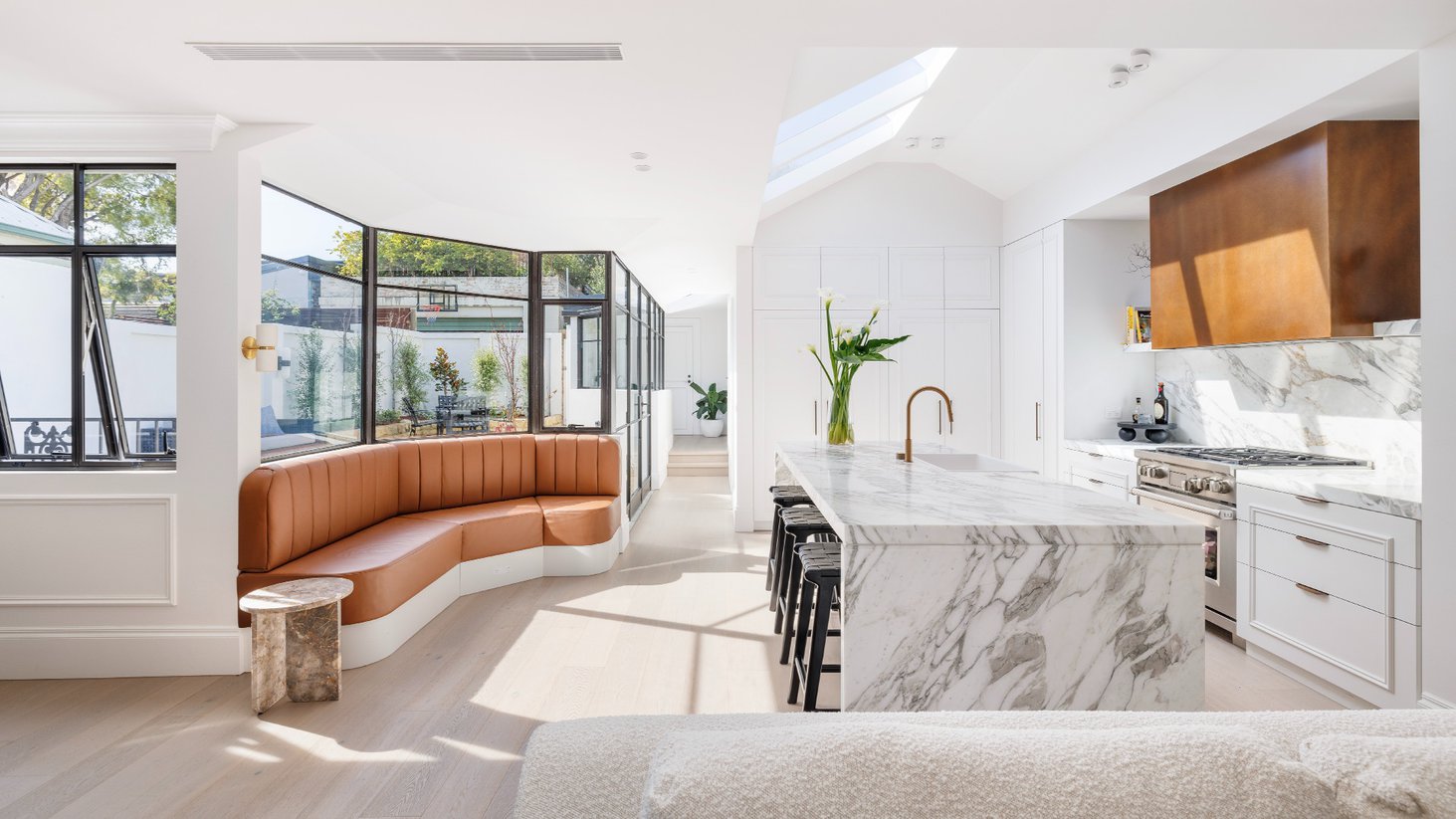 This amount of natural light is only possible thanks to the large window bay to your left as you step inside, as well as an enormous skylight that vacuums sunshine into the kitchen. Complete with a Calacatta Vagli gold marble island bench, Wolf oven, and a Qasair rangehood, it would be a pleasure to prepare a meal in.