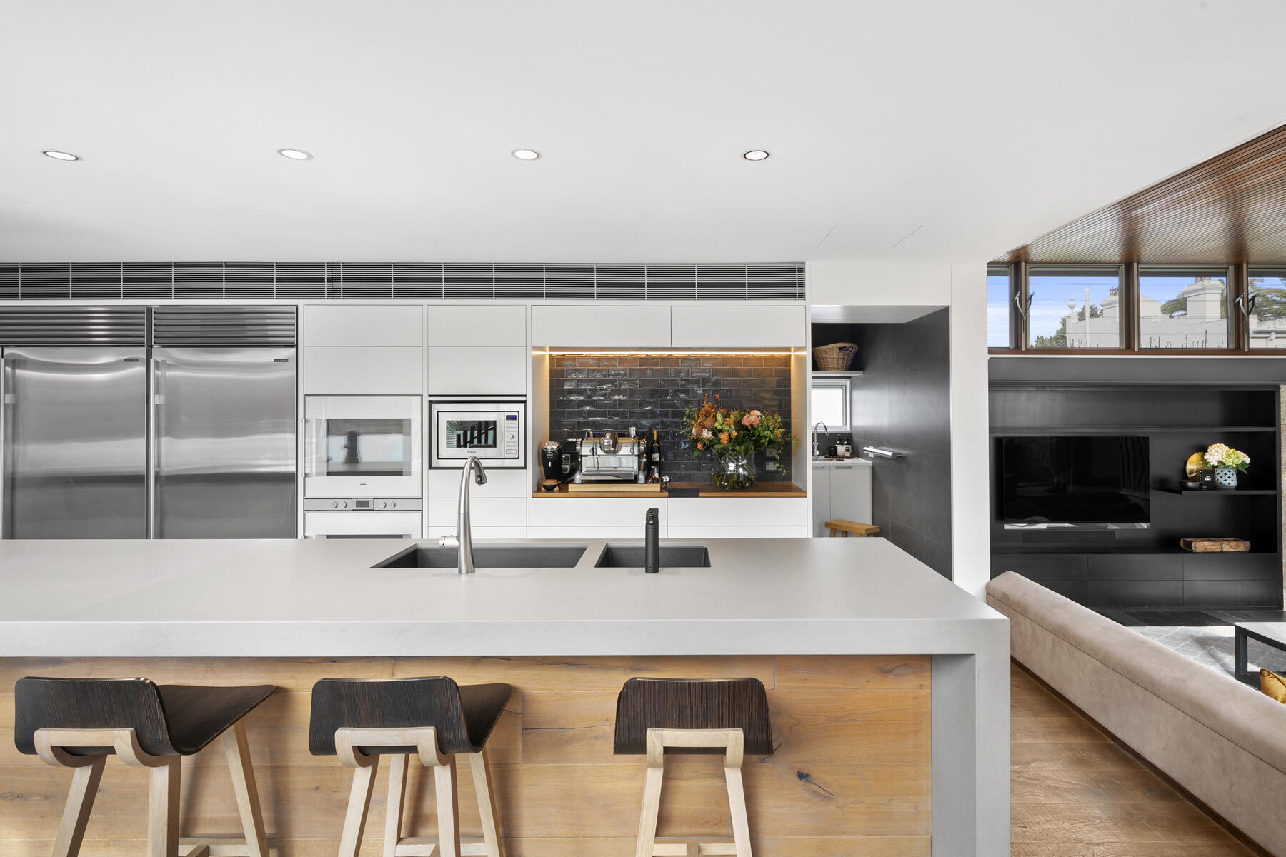 Adjacent to the masterfully crafted staircase is the kitchen, complete with a long breakfast bar island bench, a walk-in pantry and several Subzero fridges and a freezer. The rest of the ground level comprises two lounge rooms at the front and rear of the house, both of which open up onto their respective gardens.