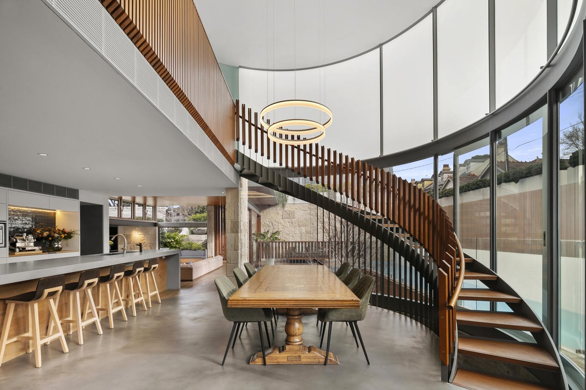 The entry to the home remains between the heritage corbels of the original terrace, with a clipped contemporary garden to greet you through timber doors before you arrive in the large open-plan living and dining space. The centre point of the house is the generously proportioned staircase which slowly spirals its way above and below the ground and makes way for a softly contoured semi-circular space that perfectly accommodates a big dining table.