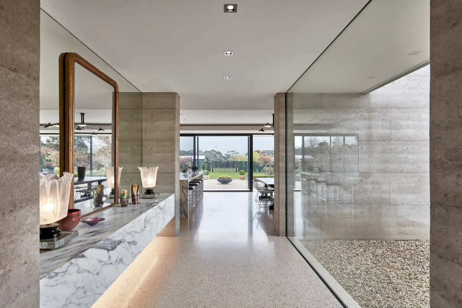 While the remarkable mountain backdrop delivers a lot of the impact 88 Honour Avenue, Macedon, has to offer, its attraction can also be found in the meticulously selected details of the residence. Many of the walls of the home are rammed earth, while the aggregate concrete floors are as thought-provoking as a contemporary art gallery. As with all of the best things in life, it gets better the closer you look at it.