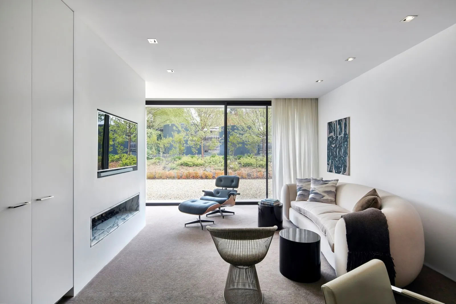 Connected to the living and dining room are the kitchen and sizable butlerโs pantry, both of which feature arabescato marble benchtops and premium Miele and Liebherr appliances, including twin ovens, induction cooktop and an integrated fridge and freezer complemented by an additional wine fridge. The marble benchtop of the kitchen serves as one of several possible social focal points in the large room, creating the perfect setting for an evening of secluded entertaining.