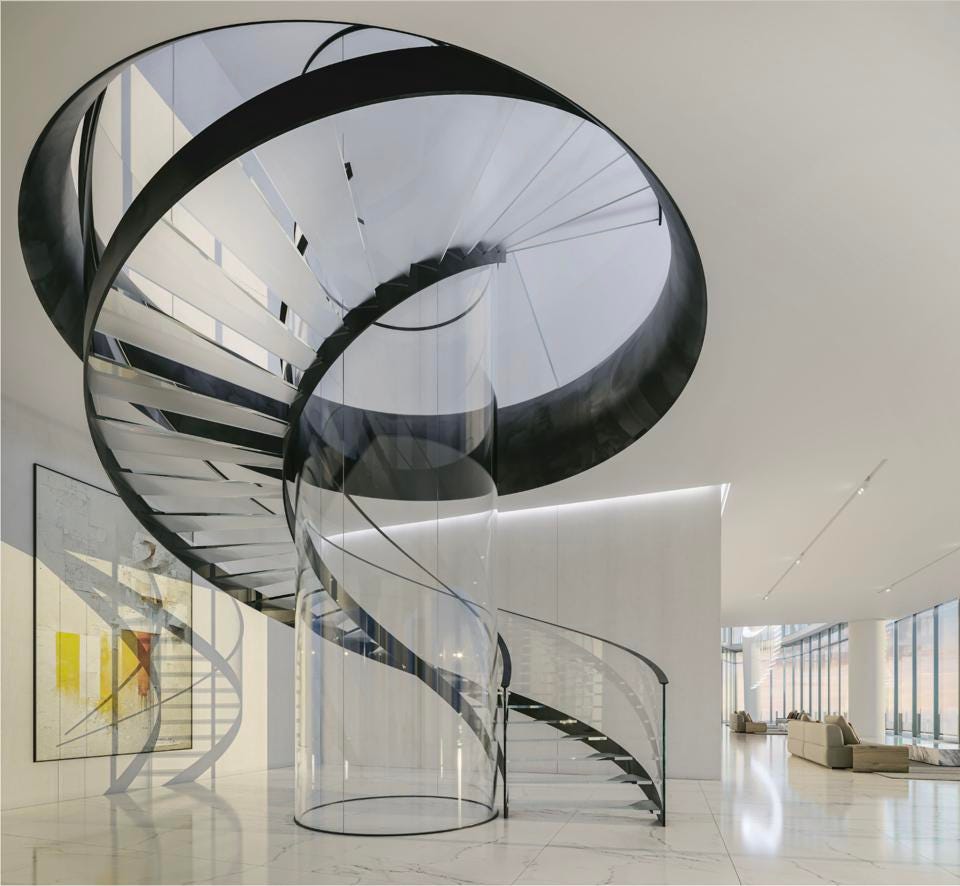 As you can see from the render weโve used as the feature image, the triplex penthouseโs full-length living room works to the buildingโs curves and mimics the prow of a ship sailing on the ocean. The double-height ceiling isnโt visible in this render, but weโve included a very tall image at the end of this article to show you the scale of what to expect.