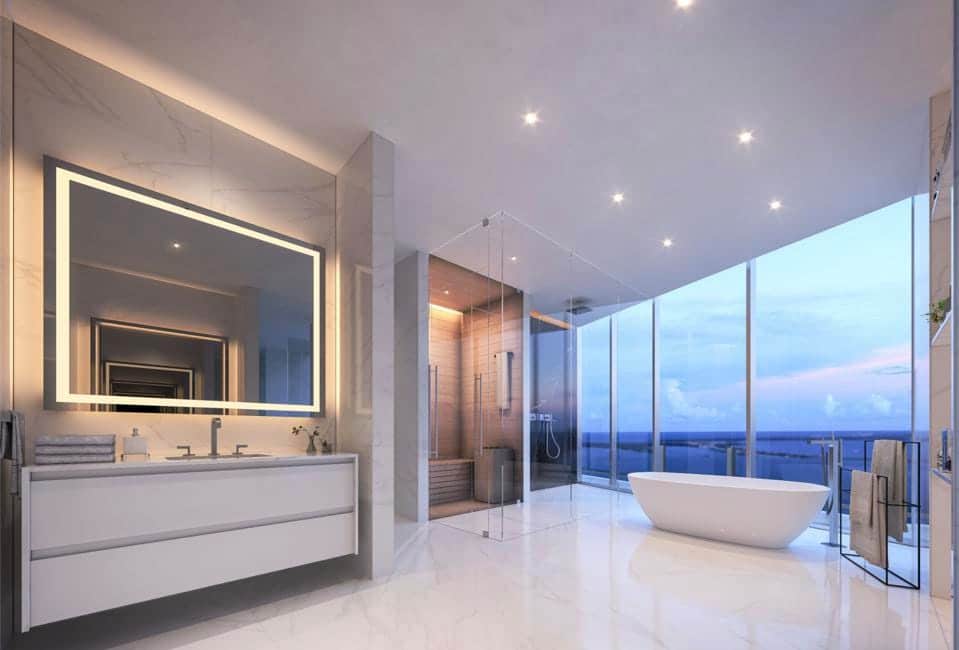 While the triplex penthouse will have terraces on each floor, arguably the most beautiful inclusion will be the wraparound balcony featured in the main bedroom, offering incredible views over Biscayne Bay. One of the bathrooms and the kitchen also get plenty of visual panache by pulling in those gorgeous ocean vistas through the large glass windows.