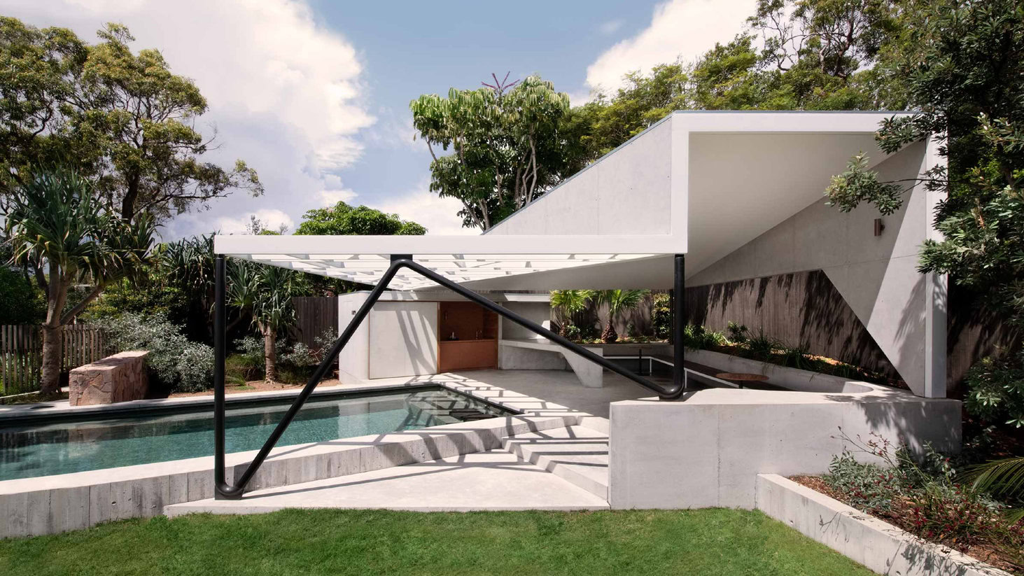 The pool is flanked by an angular cabana shaped in a way that I canโt help but be reminded of the John Lautner-designed house that appeared in the The Big Lebowski, complete with an overhanging structure that throws geometric shadows onto the sparkling waters below. The concrete cabana also contains a similarly angular singple-piece concrete bench and bar facilities, so you can mix your favourite libation without a trip back down to the house.