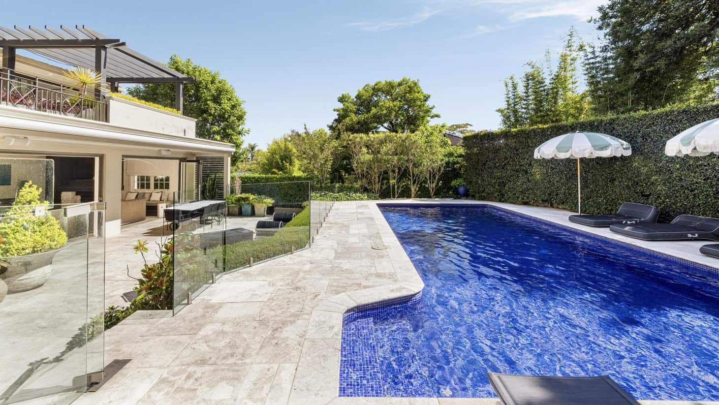 In lieu of a grass patch sporting a worn-in crease, the exterior of Clarkeโs ex-residence features a large alfresco dining area and a pool โ both of which are framed by lush gardens. Located opposite the historic grounds of Vaucluse House, the European-inspired residence pairs classical symmetry with a modern sense of luxury, featuring formal and informal living zones that effortlessly unfold as you move through the home.