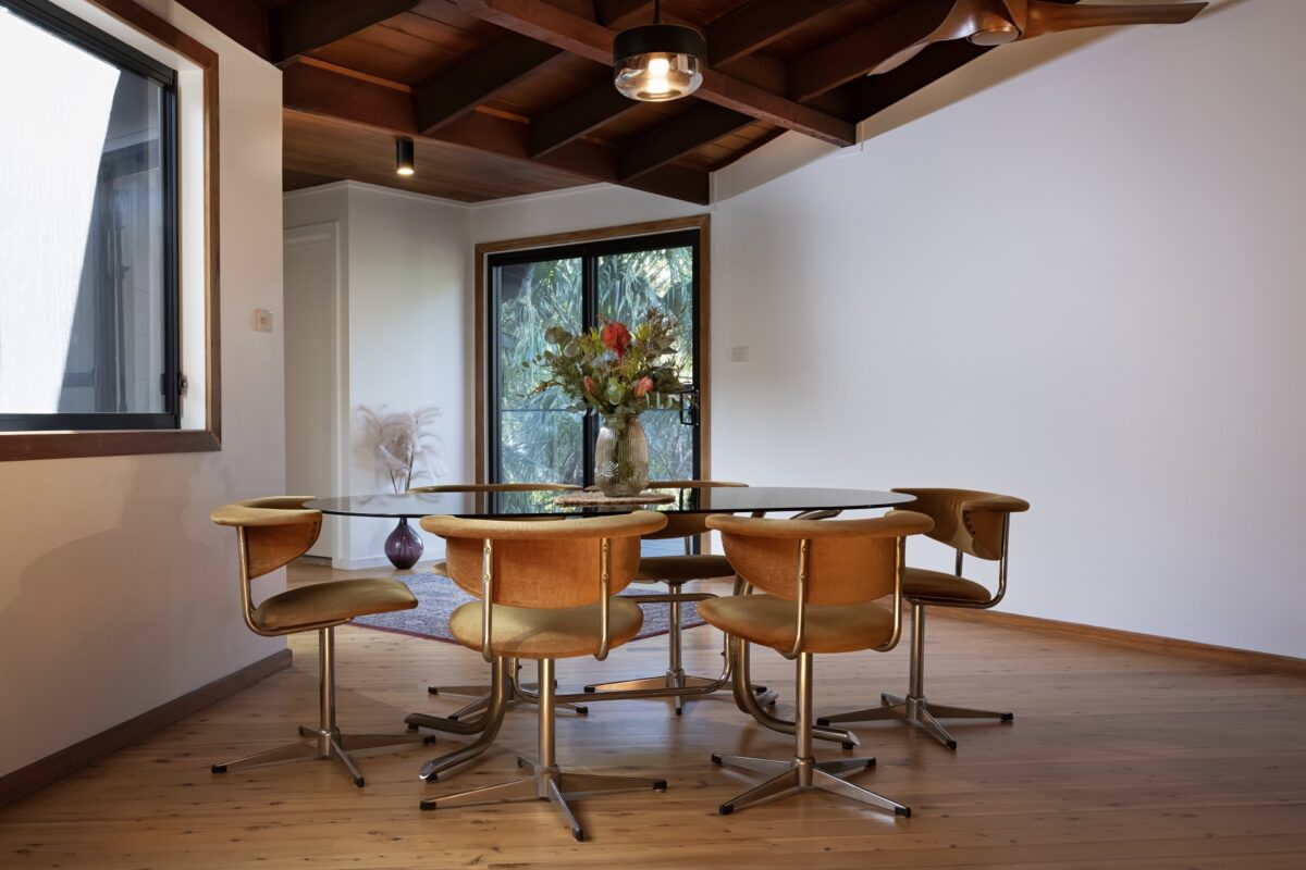 Boasting ocean and escarpment views only interrupted by swaying trees, this residence began life as a revolving, twelve-sided treehouse. Extended and refined into a four-bedroom coastal retreat, its geometry, cedar-lined ceilings, and wraparound glazing make it one of the most memorable properties in the area.