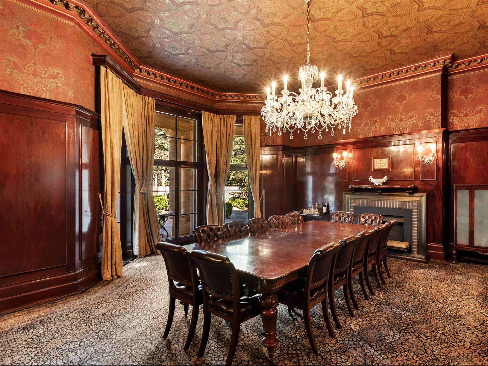 Behind its imposing facade, the stained glass, mosaic floors, and ornate fireplaces form the details of a home of remarkable craftsmanship and scale.
