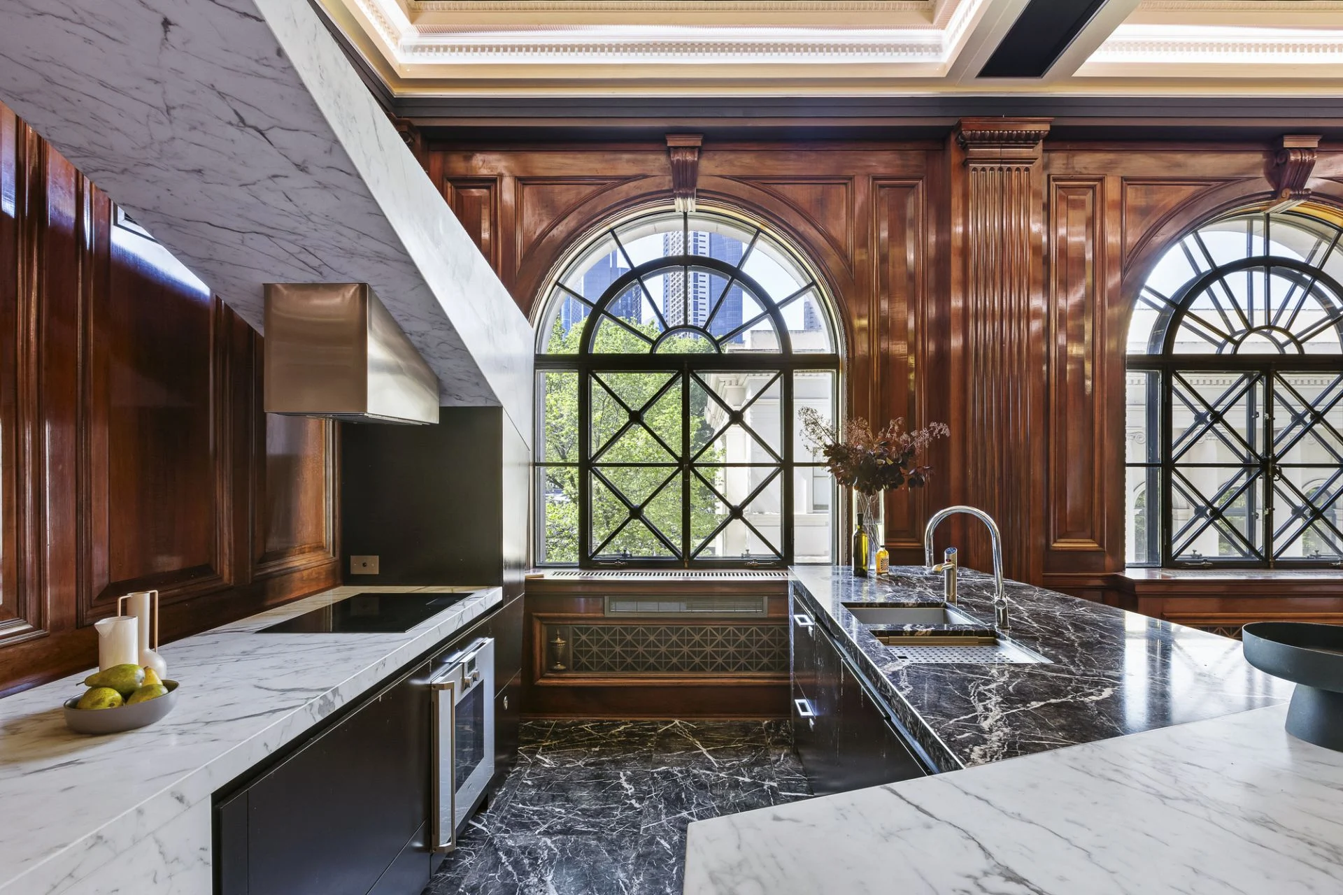 In a past life, this remarkable historical property was the boardroom and chairmanโs offices in the Port Authority Building, originally constructed in the extravagant Beaux Arts style by Sydneyโs Smith Ogg & Serpell circa 1929, and serving as a commercial hub for the city. Now, itโs been reimagined by the team at SBJ โ boasting ornate ceilings, blackwood panelling, and bronze-framed windows to introduce a measure of contemporary refinement.