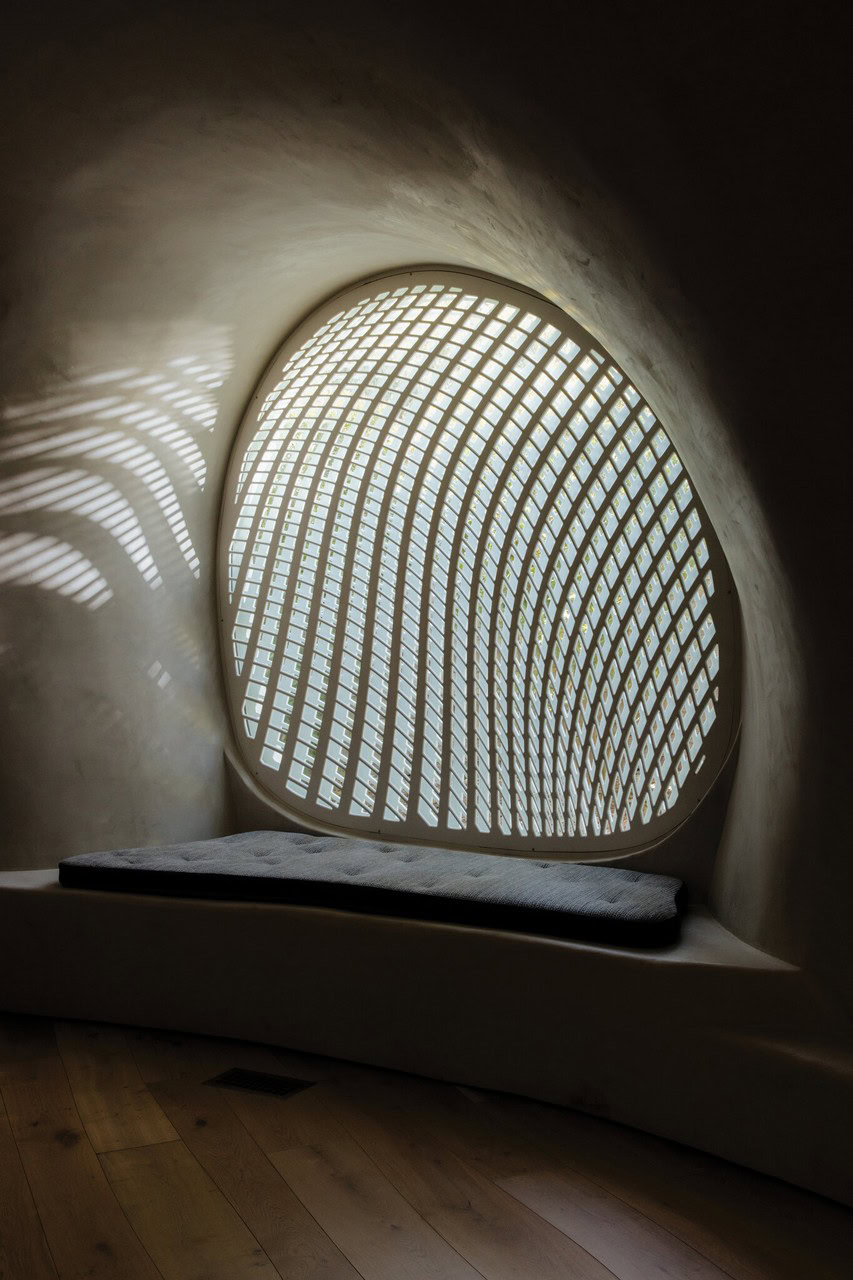 The open-plan Binishell bungalow guesthouse contains two guest rooms with views across the estate, an expansive kitchen and dining space, as well as a cosey loungeroom and a home cinema. Just like the saltwater aquarium that youโre greeted by as you enter the residence, much of the rest of the fittings and details have been custom-made to order, such as its oval front door and parametric windows.
