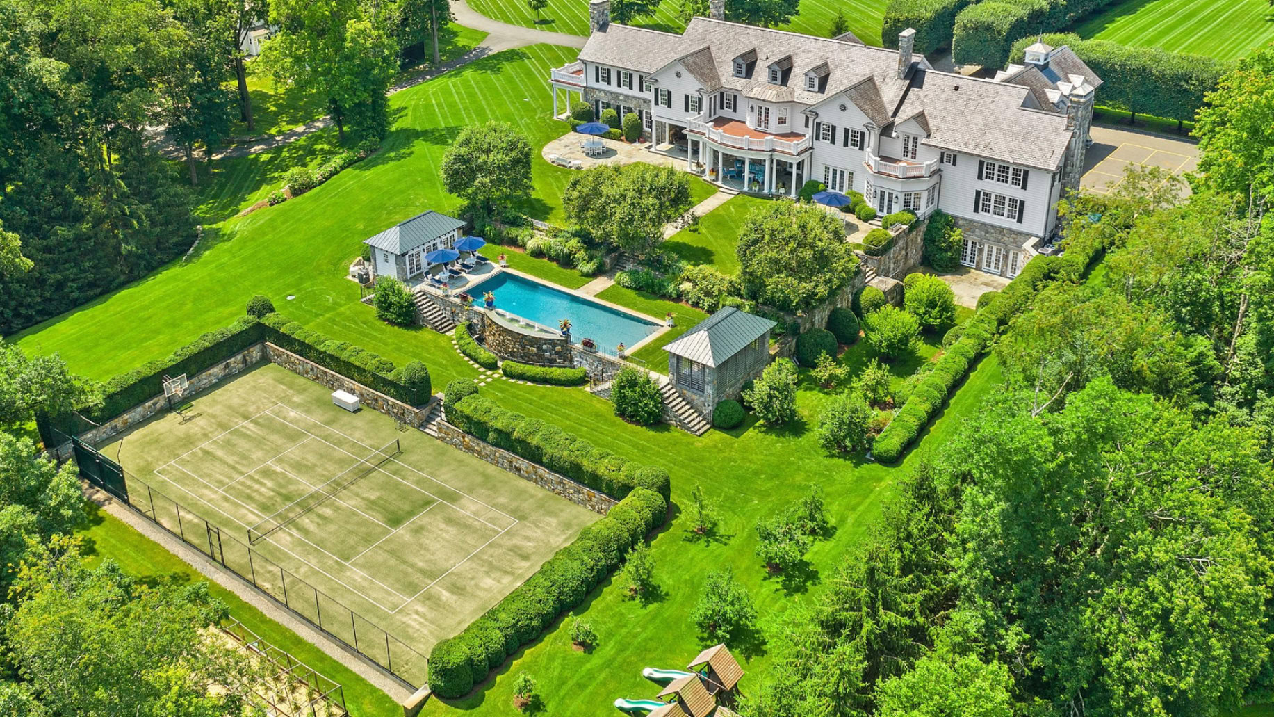 Where Stonehill kicks it up a notch is in the gym with an indoor half-court, massage room, synthetic turf tennis court, dining area which can comfortably accommodate up to 40 guests, meticulously manicured gardens, and pleached linden tree-lined driveway. The grounds also include a four-bedroom guest house, three-bedroom cottage, and two-bedroom cottage.