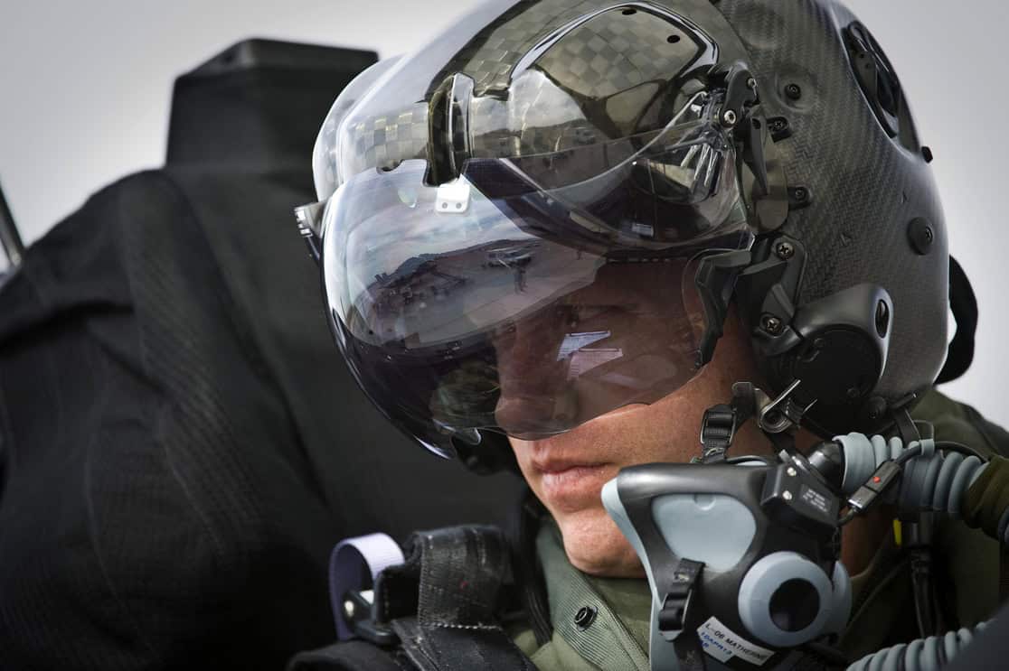 With the amount of data being conveyed, Bluetooth and Wi-Fi arenโt quick enough so the helmet is connected via a thick strand of Kevlar-sheathed cords. When tethered in, pilots are granted the visual capabilities of Superman and then some. The pilot can literally see through the base and walls of the aircraft thanks to six cameras mounted on the outside of the plane and projected into the fighter jet helmet.