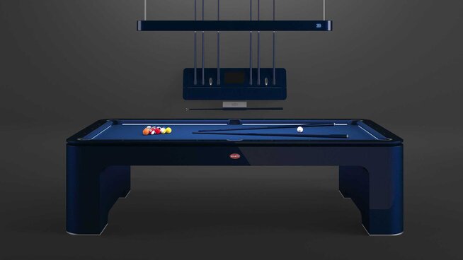 - 1 x wall-mounted cue rack made from matching carbon w/ 13-inch touchscreen to track scores
