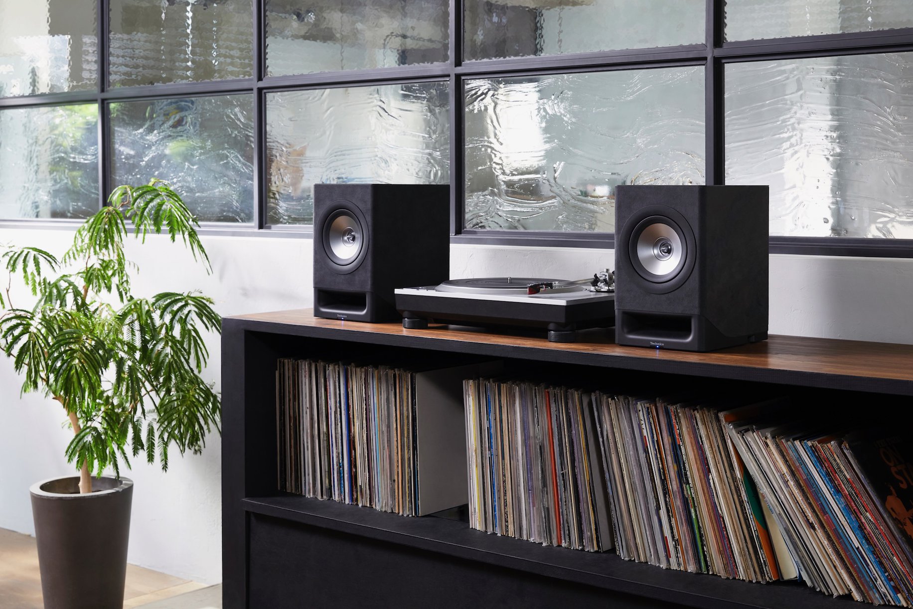 The active speakers (with integrated amp) can be incorporated into a traditional Hi-Fi system, used alongside a turntable, or in place of a TV soundbar.