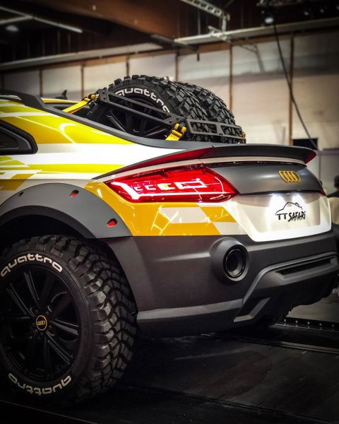 What resulted was the Audi TT Safari, a concept that takes the brandโs Quattro mantra to extremes, with huge flared guards accommodating massive rolling stock with extreme off-road rubber. The hardcore offload racer wears its own distinctive race livery and its dark body is highlighted with striking yellow graphics.