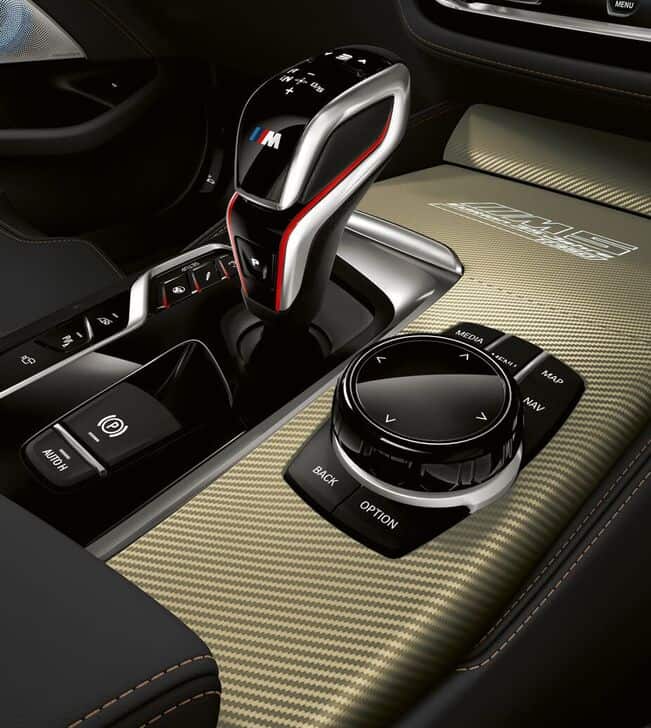 Interestingly, youโll find that no M5 badge has been slapped on the back โ itโs actually been officially de-badged. Within, passengers will experience a gold anodized aluminium grained to look like carbon fibre, alongside a full leather interior with stitching to match the shiny trim. The centre console is engraved with โM5 Edition 35 Jahreโ (we assume you can guess what that means).