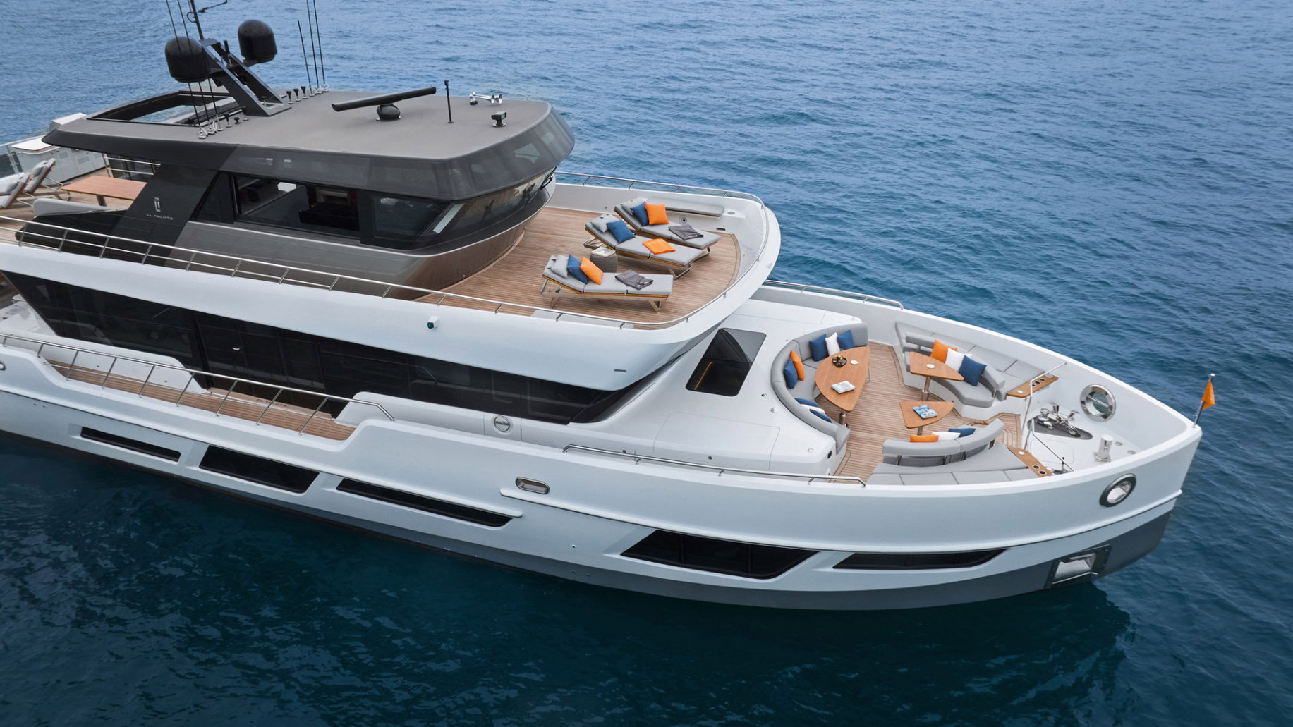 The CLX96 certainly makes a statement thanks to the vision of Forakis, featuring a plumb bow and reverse-angle deckhouse that reminds of the exploration boats of times gone by, thereโs a sense of distinct purpose that arrives with this vessel. With a sizable lounge area at the pointy end of the CLX96, it also features large deck areas aft of the top deck, as well as an extendable beach club at the water level.