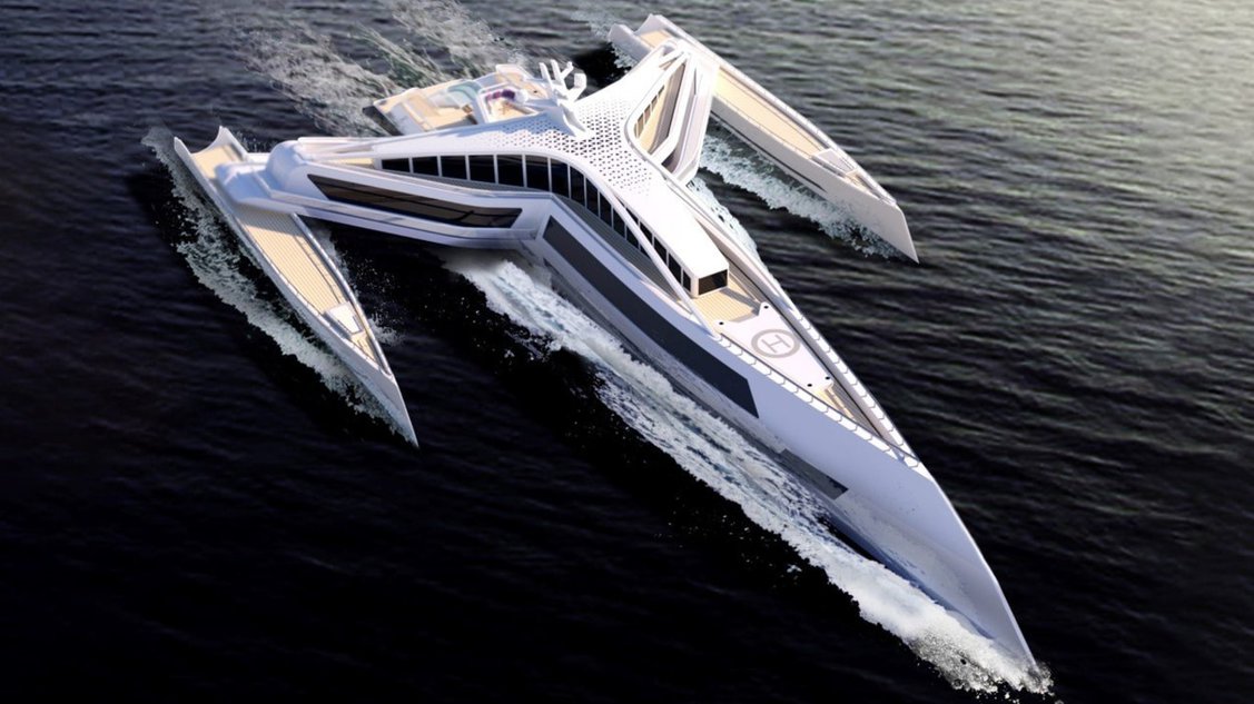 The superyacht has a tri-hull structure, with the main hull connected to two smaller hulls by a set of wing-like bridges which, according to the designer, divides โthe hull wings into three volumes.โ