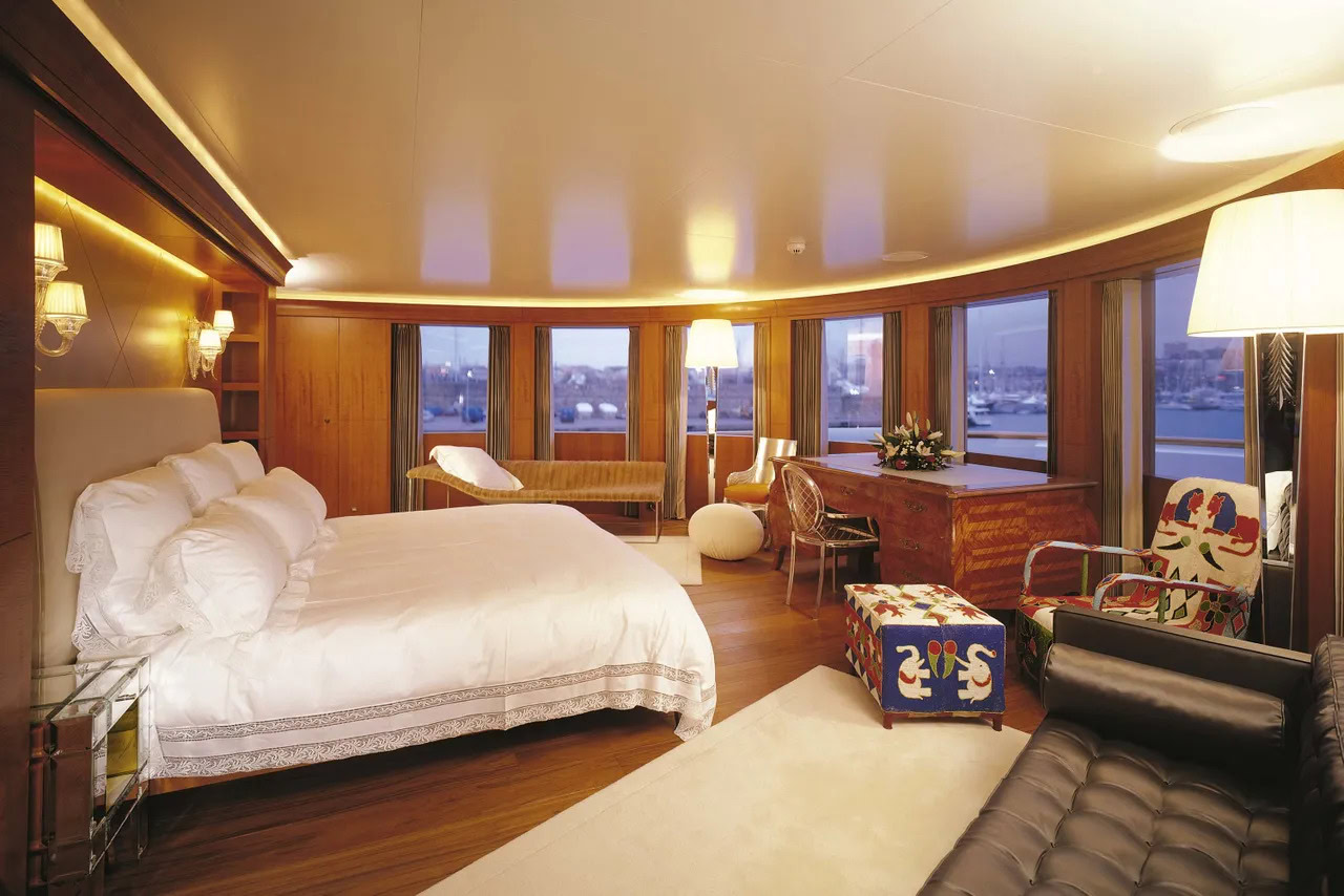 With sweeping round edges across its multi-deck floor plan and elegant wood panelling, the vessel embraces a soft symmetry thatโs rarely seen in modern naval architecture which is consistently favouring sharper angles. De Voogt Naval Architects commanded the design of the aluminium superstructure and steel hull, while French designer Philippe Starck embraced a host of โquirkyโ features for the yachtโs interior.