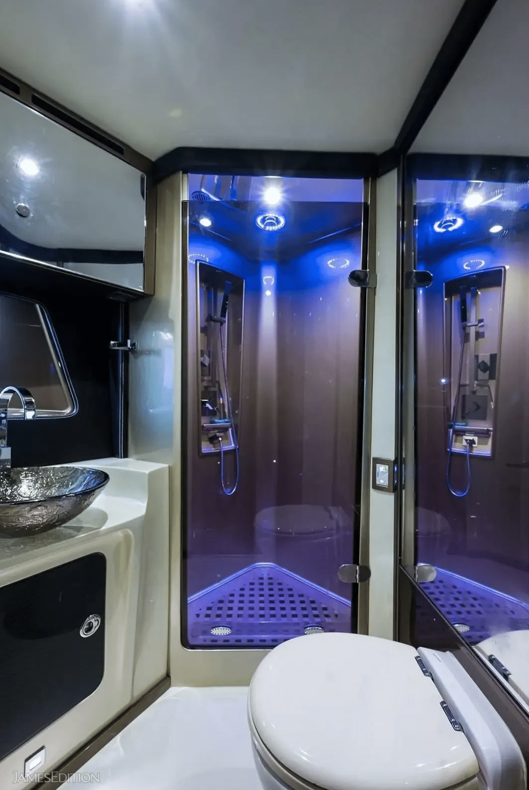 If that Florida sun is too hot to handle, you can venture below deck to find three staterooms with en suites and a dayhead. With 18 hull-side windows, skylights and well over two metres of headroom, the Nor-Tech Super 80 Roadster feels open below deck, too.