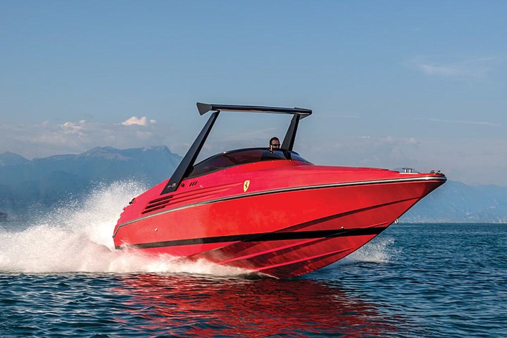 How can a boat replicate a car? Well, it begins with appearance. The Riva Ferrari has the unmistakeable Testarossa side strakes, tail, badging, and charismatic red colouring that is synonymous with Ferrari. For added speed (and aesthetics) an F1 Ferrari spoiler was added overhead.