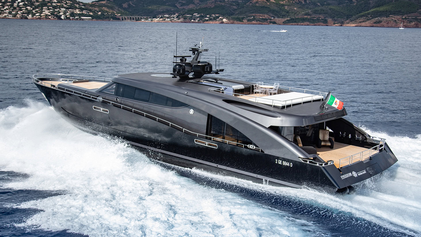 โTo emphasise and convey the yachtโs sporty nature, it was decided to paint the hull metallic black and the superstructure metallic dark grey.โ