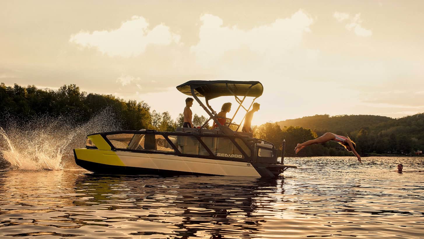 Powering the Sea-Doo Switch is an impeller-based Rotax jetski engine, which actually feels a lot like a jetski thanks to its handlebars in place of a steering wheel. Thanks to the jetski engine, the Sea-Doo Switch also has the capability to break and reverse, which is a first in a pontoon craft.
