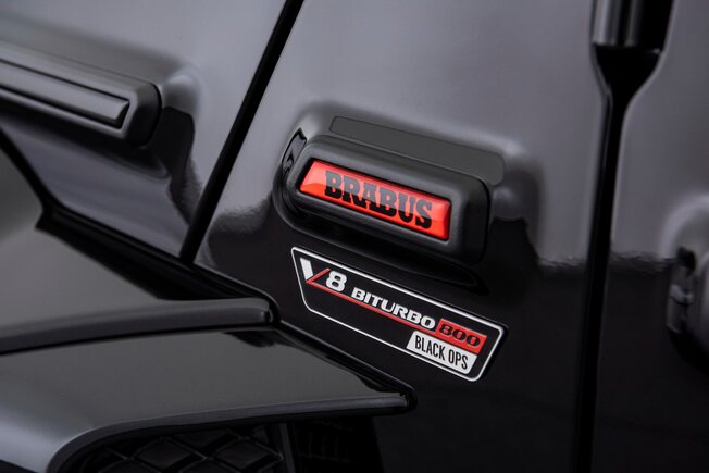 The โBlack Opsโ is finished with a black gloss exterior with subtle red markings on the radiator grille and wheel spokes. The interior features dark grey leather with red stitching and carbon fibre, along with a badge exclaiming, โBRABUS BLACK OPS 800 1 of 10.โ