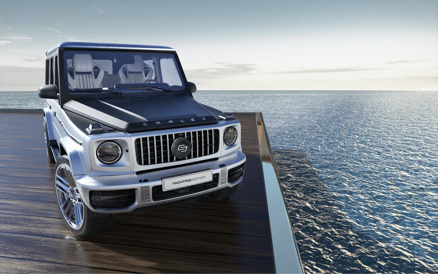 As youโd expect, the Carlex Design G-Yachting Edition features quite a few nautical themed accents, championing luxury and marine style. The exterior โ available in polar white or brushed silver โ is as mean as ever, showcasing bold lines and a mean finish. The spare wheel cover even has a compass engraved into it.