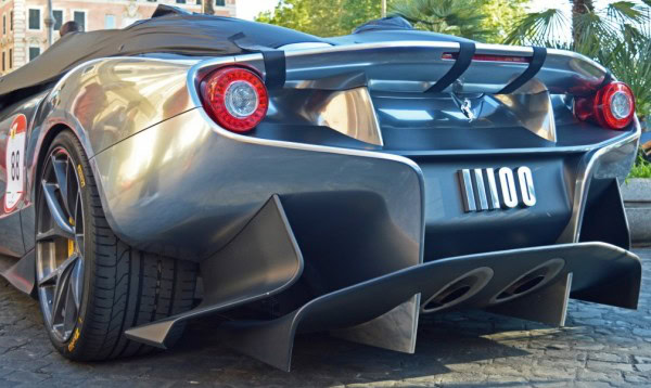 The rear is where this car makes a name for itself. The diffuser on this car puts F1 cars to shame. The aggressive styling reveals the huge tires and shows two massive exhaust tips. Another small yet interesting design piece is the floating Ferrari logo.