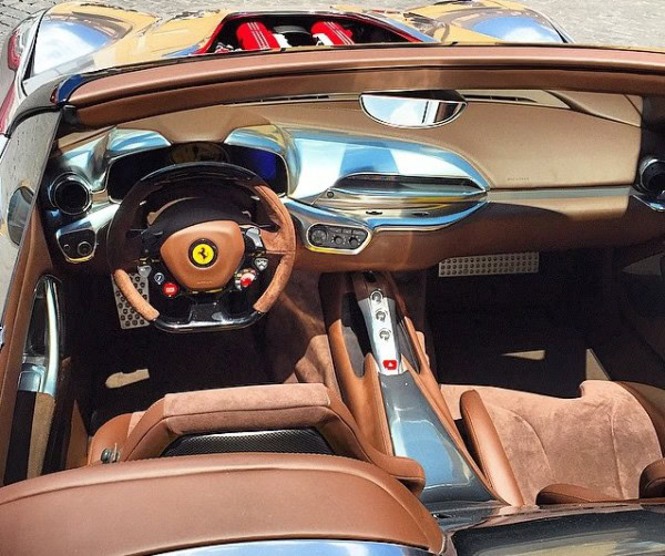 The interior uses the silver from the exterior, as well as a mix of brown and alcantara leather. Although unconventional, the car pulls off the brown well, but if it were up to me I would have done a blue interior instead of brown. The roadster look is fantastic, and is perfect for a Riviera cruiseโฆas long as it doesnโt rain! If Ferrariโs Special Projects program keeps doing things like this they are sure to have customers lining up for years to come.