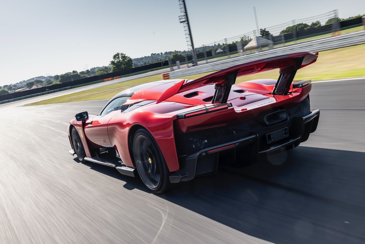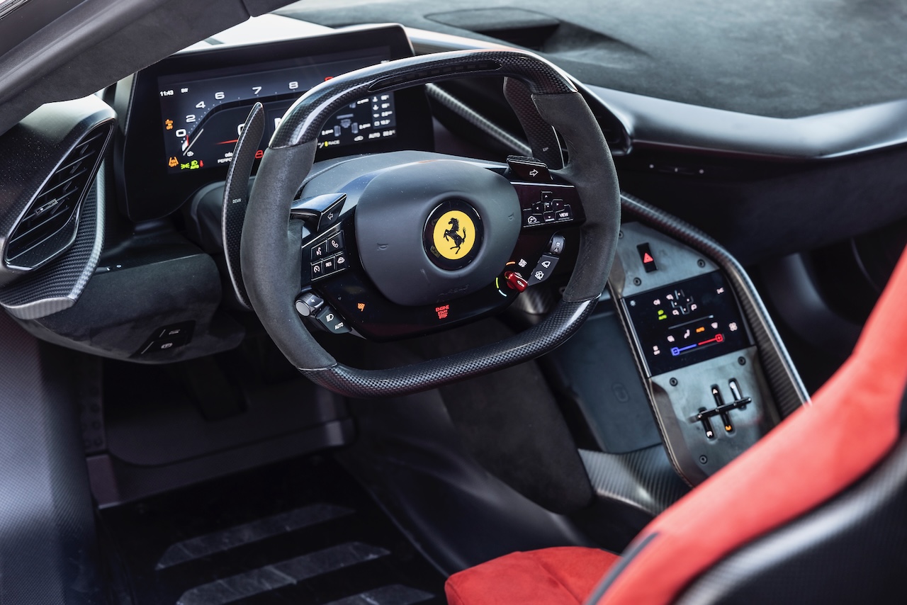 The steering wheel on this ridiculous, beyond bonkers hypercar is a thing of squared-circle beauty, laden in now sodden Alcantara. It offers barely more than one full turn, lock-to-lock. That’s by design. Because in the fastest Ferrari the world has ever seen, you don’t have time to cross your arms – or even adjust your hands – mid-corner.
