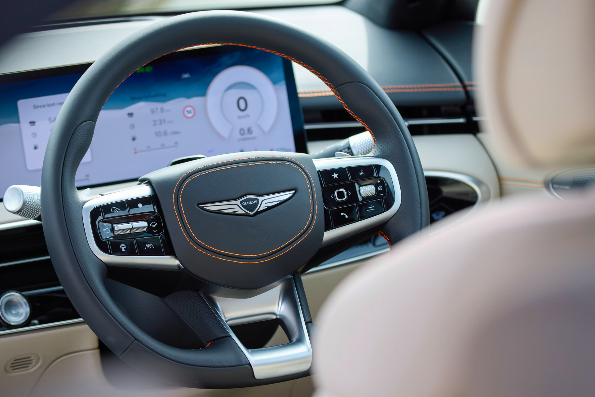 Even before pressing the engine start button, I thought, โThis thing feels good, and how good are these orange seatbelts!โ As I pulled away from Hyundai HQ, I was impressed by the wonderfully light and graceful steering feel, which manages to still be purposeful and direct, controlled by a thick, heated wheel.