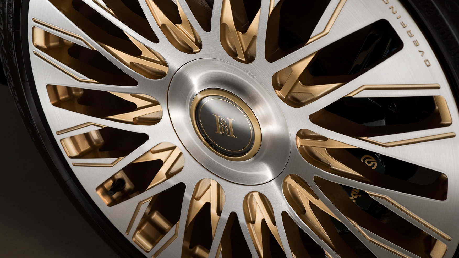 Overfinchโs bespoke bonnet script sits above it in dignified fashion, while the sides reveal their own secrets โ 23-inch multi-spoke forged alloys created solely for these bad boys, capped with self-levelling centrepieces bearing the Holland & Holland hallmark.