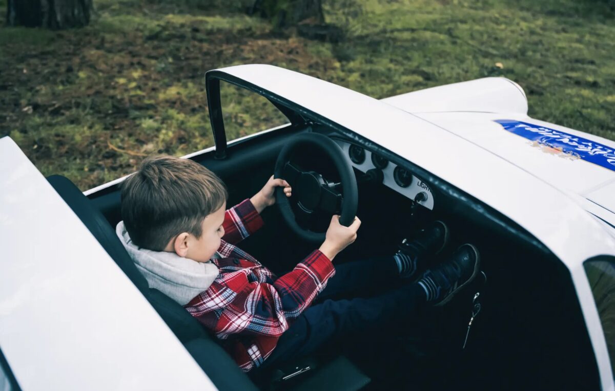 With a distinctive blue and white paint job, the links between the Paris-Dakar-winning car and this replica are obvious. Instead of a 3.2-litre boxer-six engine, the children’s version built by Halfscale Cars is powered by a 400-cc engine capable of an 80km/h top speed.