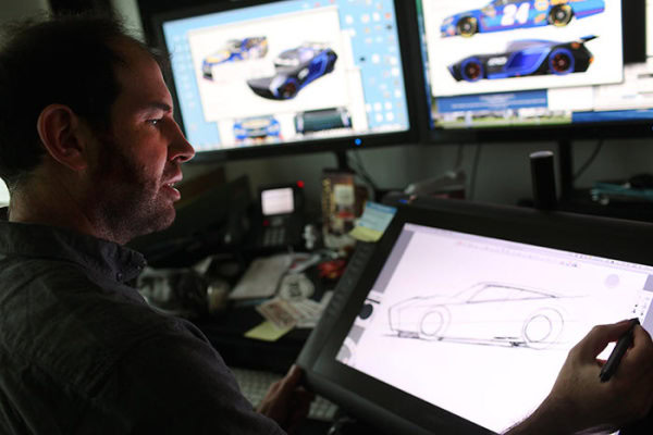 My focus is to make a character that looks as best as it can on screen. I grew up Detroit, my dad was a car designer for 43 years at GM. Iโve been drawing cars from a really early age, so I also understood how to make these designs work in the real world. I think the pressure is to design a car that lived up to the truth in material that John Lasseter really pushes in these films, make it a car that fans of racing, people who admire car design, will be drawn to on screen as well as perhaps a physical state [he points to Storm parked below us].