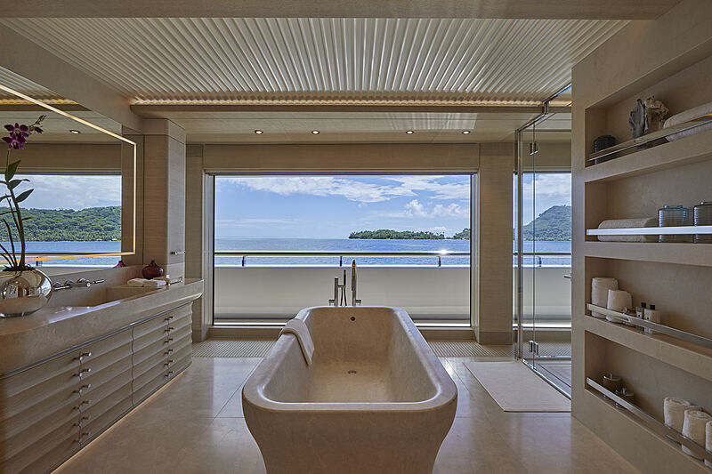 The yacht can accommodate up to 22 guests across her 3,600 GT interior and features a gym, cinema, day club, salon and spa. The owner’s quarters include a massive freestanding bathtub and an office.