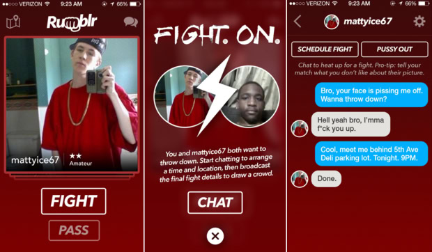 First we showed you Tinder for the elite, now from what we assume must be the trailer parks of the midwest comes Rumblr, a self-proclaimed โTinder for fightingโ designed for โrecreational fighters to find, meet, and fight other brawl enthusiasts nearby.โ