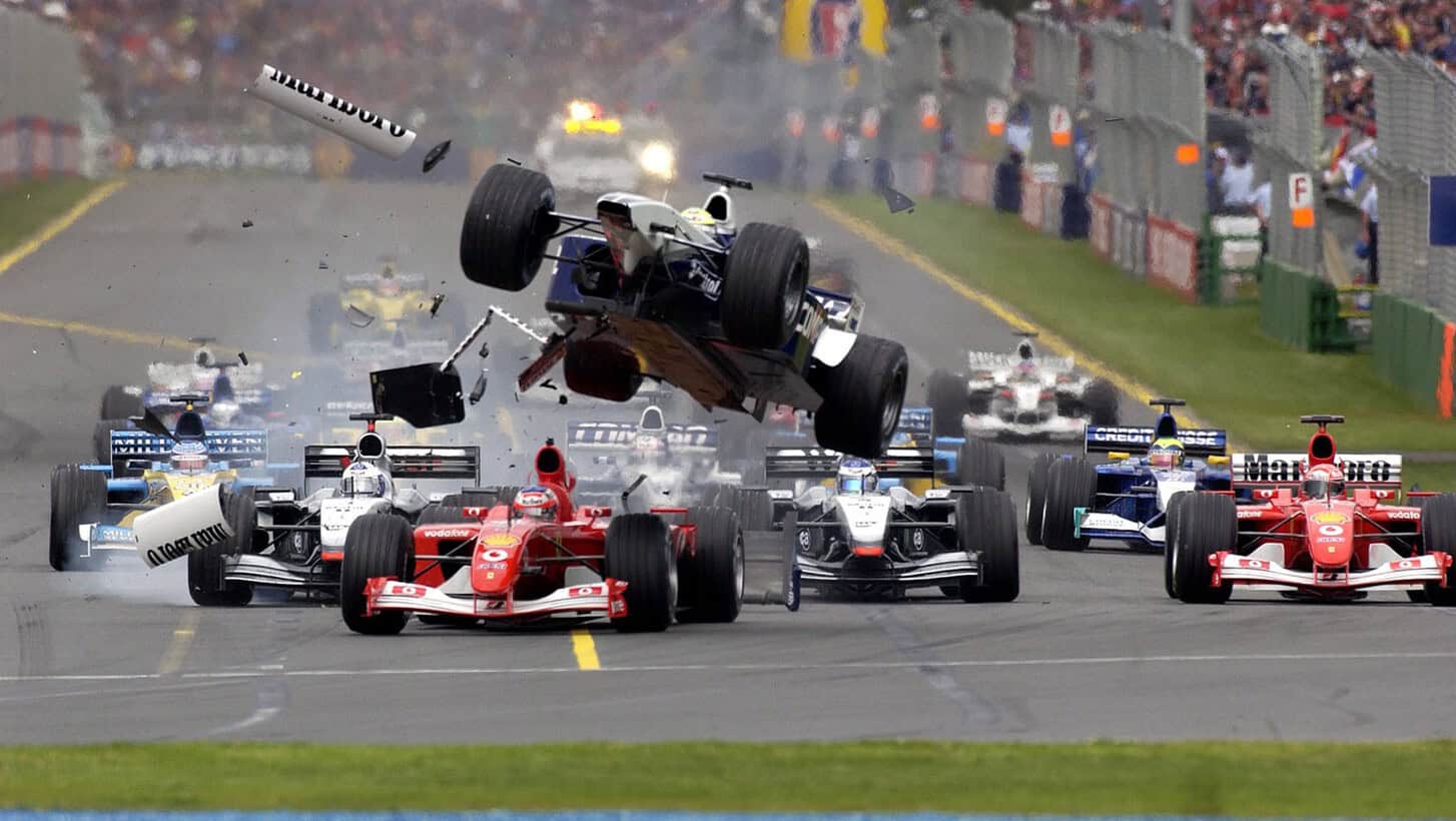Very little explanation is necessary for this debacle. Itโs probably one of the most memorable Formula 1 starts of all time. Ralf Schumacher turns his vehicle into an airborne missile after being propelled forward from the spin of a wheel on the car in front. Hence the feature image.