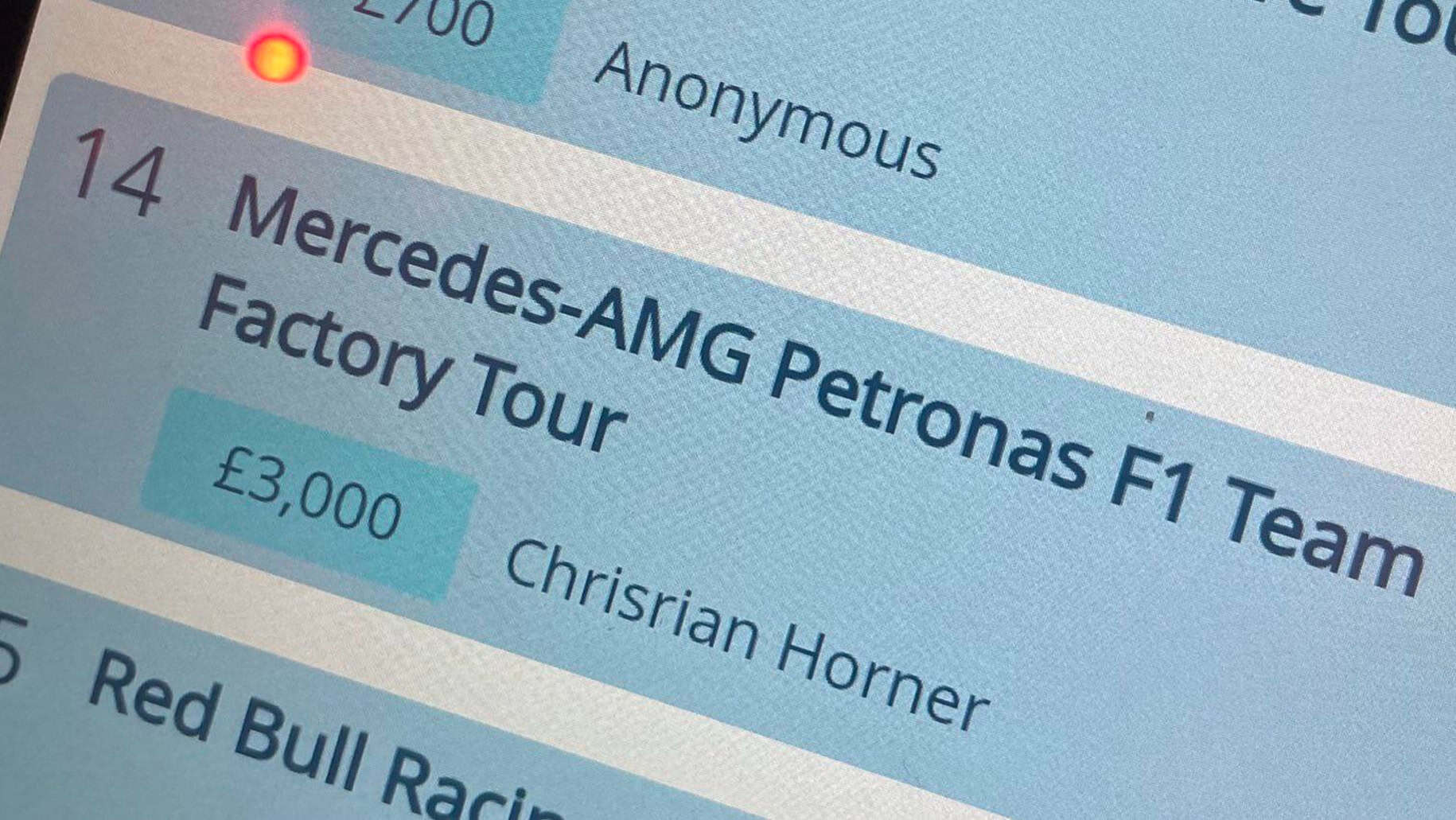 Stepping up to do their part, Mercedes generously donated a tour of its Brackley site. Before long, the opportunity was noticed by a certain team principal, who pounced on Lot #14 for ยฃ4,000 under the name โChrisrian Horner.โ Yesโฆ โChrisrian.โ Whether this was the digital version of throwing on a fake moustache or simply a typo is unclear.
