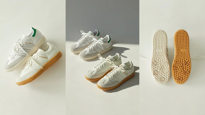 Arriving in two different colourways, the KITH x adidas Samba Golf shoes serve up either a double-white upper version with contrasting gum-tone midsole (tint white); or a Stan Smith-inspired edition with green trim and eggshell midsole (classic white). Both boast golden โKITH CLASSICSโ lettering along their flanks, as well as uppers constructed from soft premium leather and a suede-reinforced T-toe overlay.