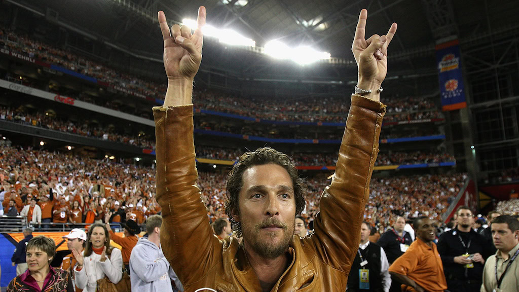 Last weekend, McConaughey’s alma mater the Texas Longhorns (University of Texas at Austin) were playing their arch rivals the Fighting Irish (University of Notre Dame) and the big fella decided his team needed a bit of a pep talk. We only get to see a bit of the speech below, but needless to say it did the trick, with his boys getting up in a 50-47 double overtime thriller in front of 102,315; the largest football crowd in Longhorns football history.